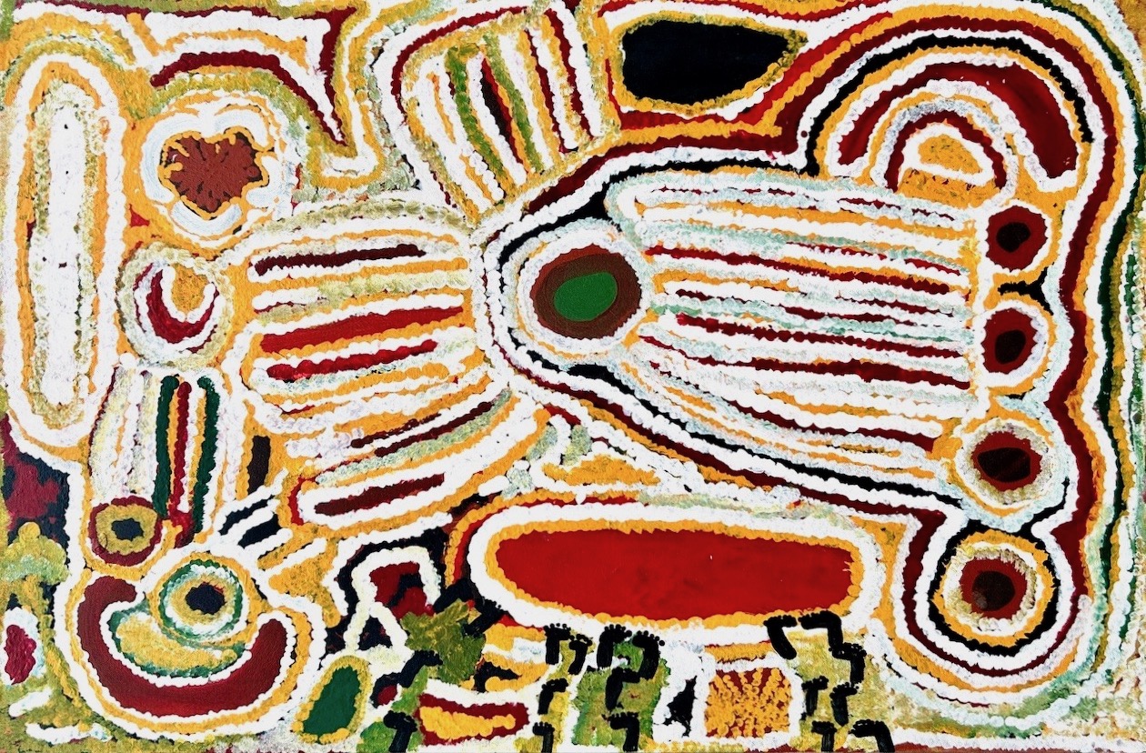 Nyumi is a very strong culture woman, dancer and an enthusiastic teacher of culture to children, ensuring the traditional dances and songs are kept alive. Nyumi had four daughters and three of them are still living and beginning to paint, which is strongly encouraged by Nyumi. Brandy Tjungurrayi and Patrick Olodoodi, both senior Law men and recognised artists, are Nyumi’s older brothers.