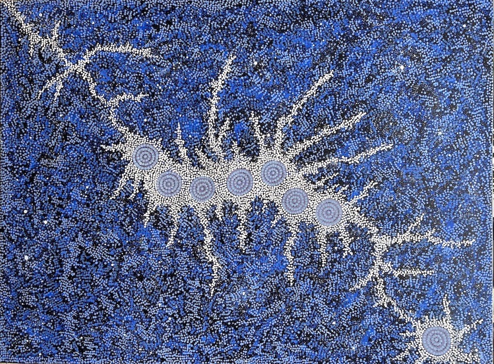 Gabriella Possum Nungurrayi (born in 1967) is a contemporary Indigenous Australian artist born in the Papunya community, she followed in her father Clifford Possum Tjapaltjarri’s footsteps and became an internationally respected painter. Examples of her work are held in many gallery collections in Australia and elsewhere, including the National Gallery of Australia, the Flinders University Art Museum, the Kelton Foundation Collection, the Museum & Art Gallery of the Northern Territory and the Royal Collection.
